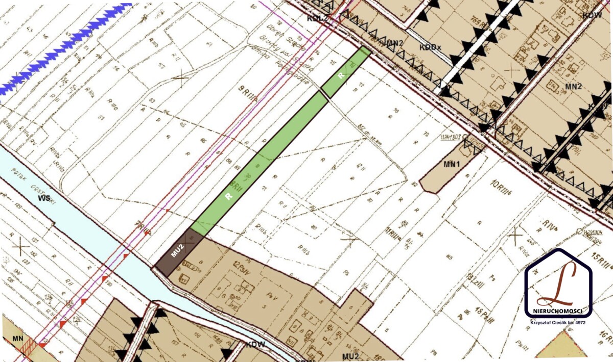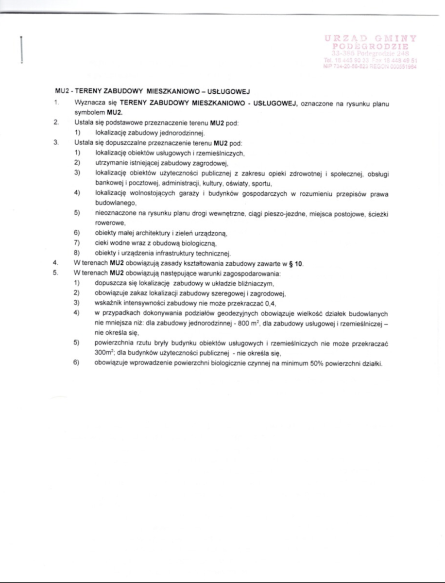 MNU - tereny zabudowy mieszkaniowo - usługowej ( tereny te obejmują ok. 13 arów z całej powierzchni nieruchomości ). Szerokość działki w terenach budowlanych wynosi 21 metrów.